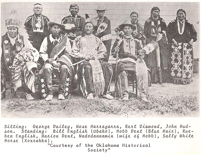 Image of George Dailey, Nose Harragarra, Bert Diamond, John Hudson, Bill English (Ubaho), Hobb Dent (Blue Hair), Rueben English, Marion Dent, Nadodannamin (wife of Hobb), and Sally White Horse (xoxrahka). Courtesy of the Oklahoma Historical Society. Reproduced from Jiwele-Baxoje, Wan'shige Ukenye Ich'e, Otoe-Iowa Indian Language, Book 1. View larger image here.